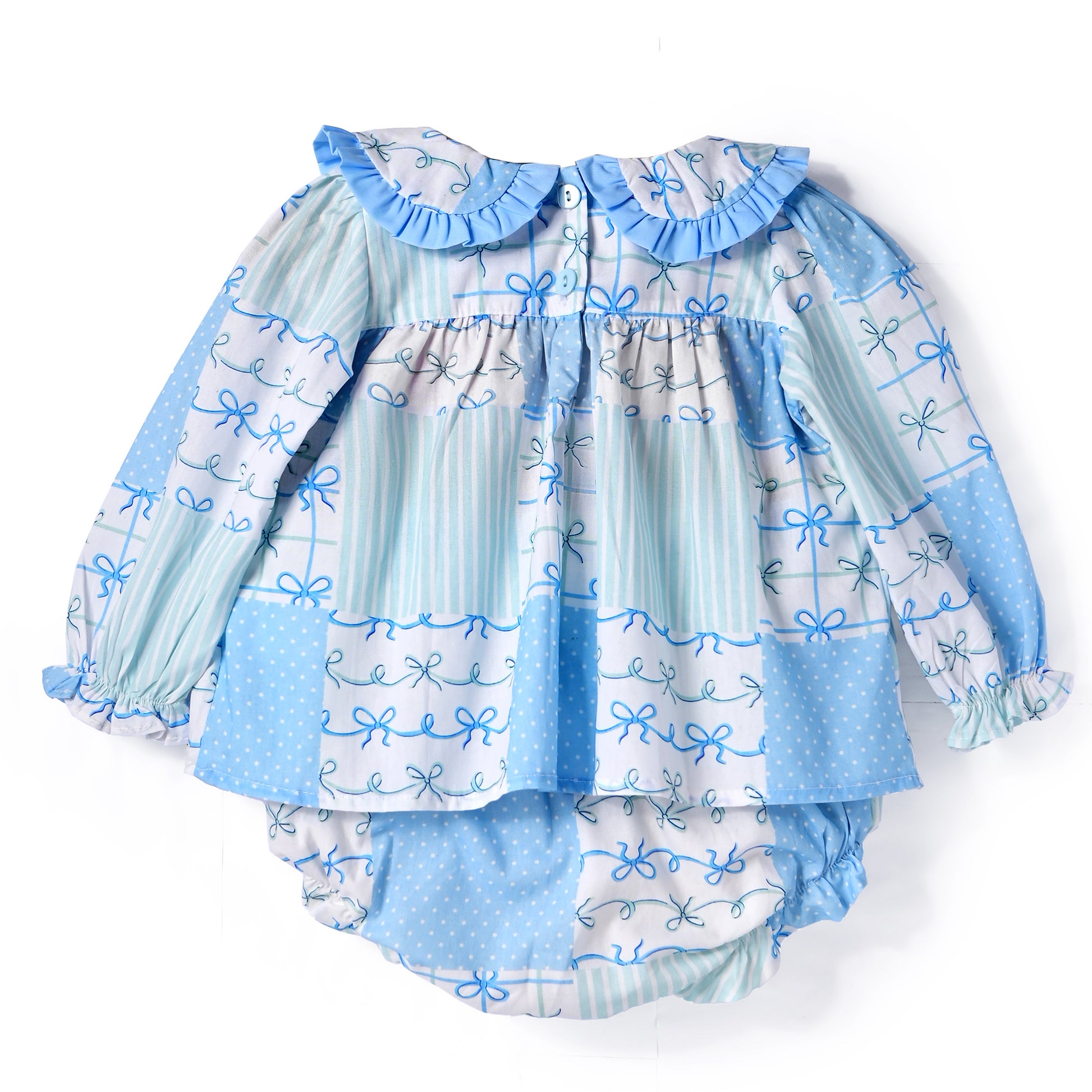 Bow Polka Dot Long Sleeve Diaper Set, Blue/White