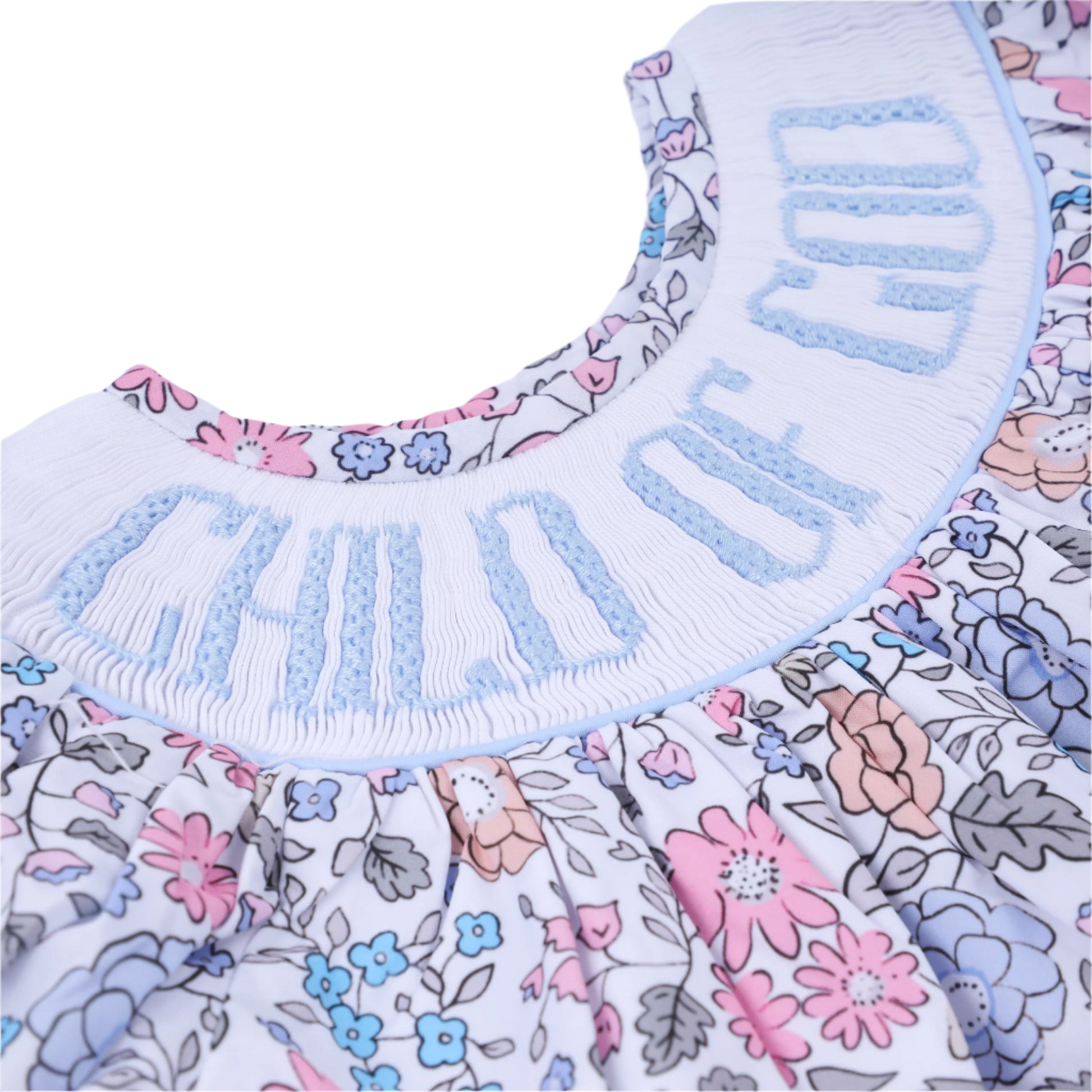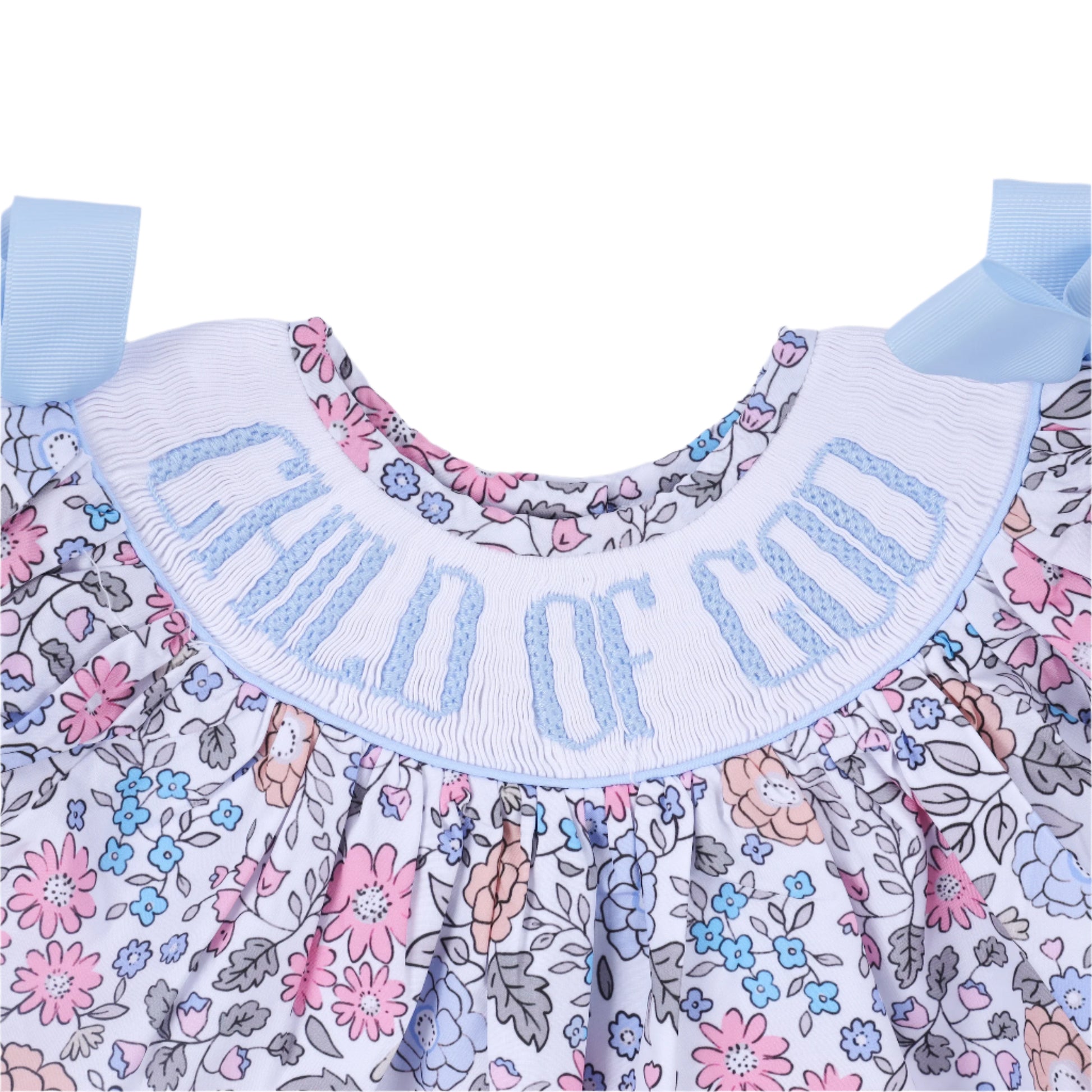 This child Of God smock diaper set features a beautiful floral design, with a side tie for added detail. The diaper style adds a touch of playfulness, perfect for your little one's wardrobe. Show off their unique style and faith with this charming smock bubble.
