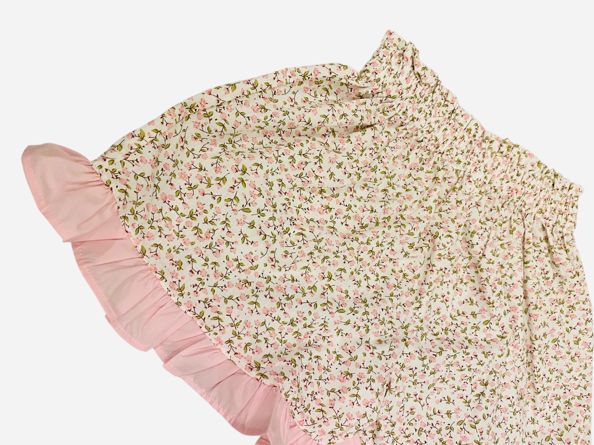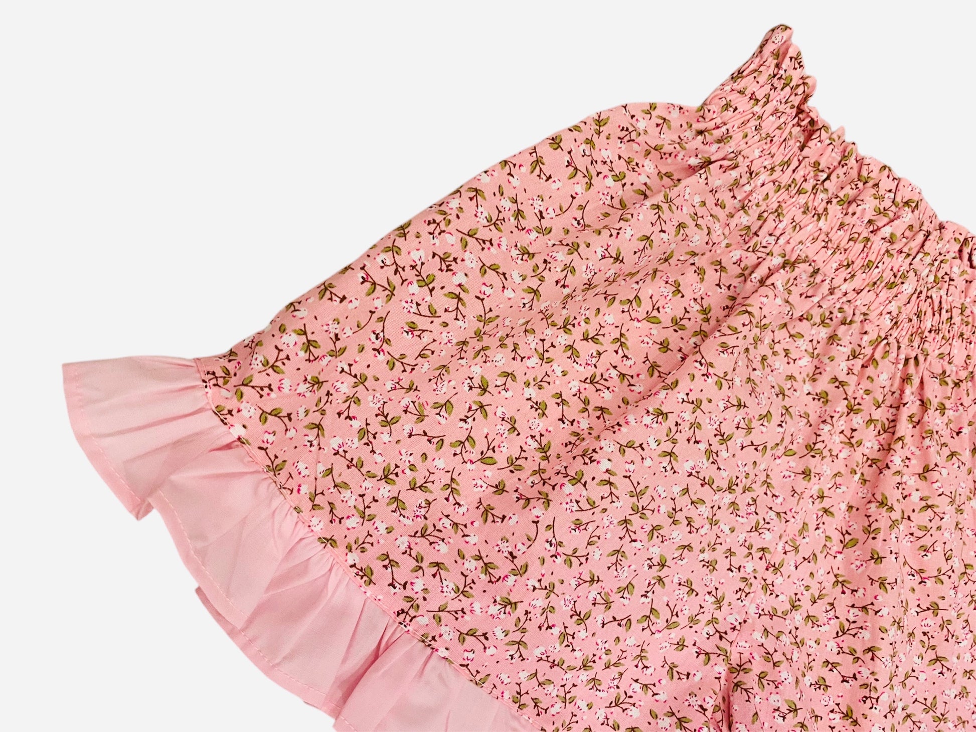 This floral flutter side tie short set features delicate floral flutter sleeves and a charming ruffle collar. The side tie details add a touch of elegance, while the short provides comfortable and stylish coverage. Perfect for any little one's wardrobe.