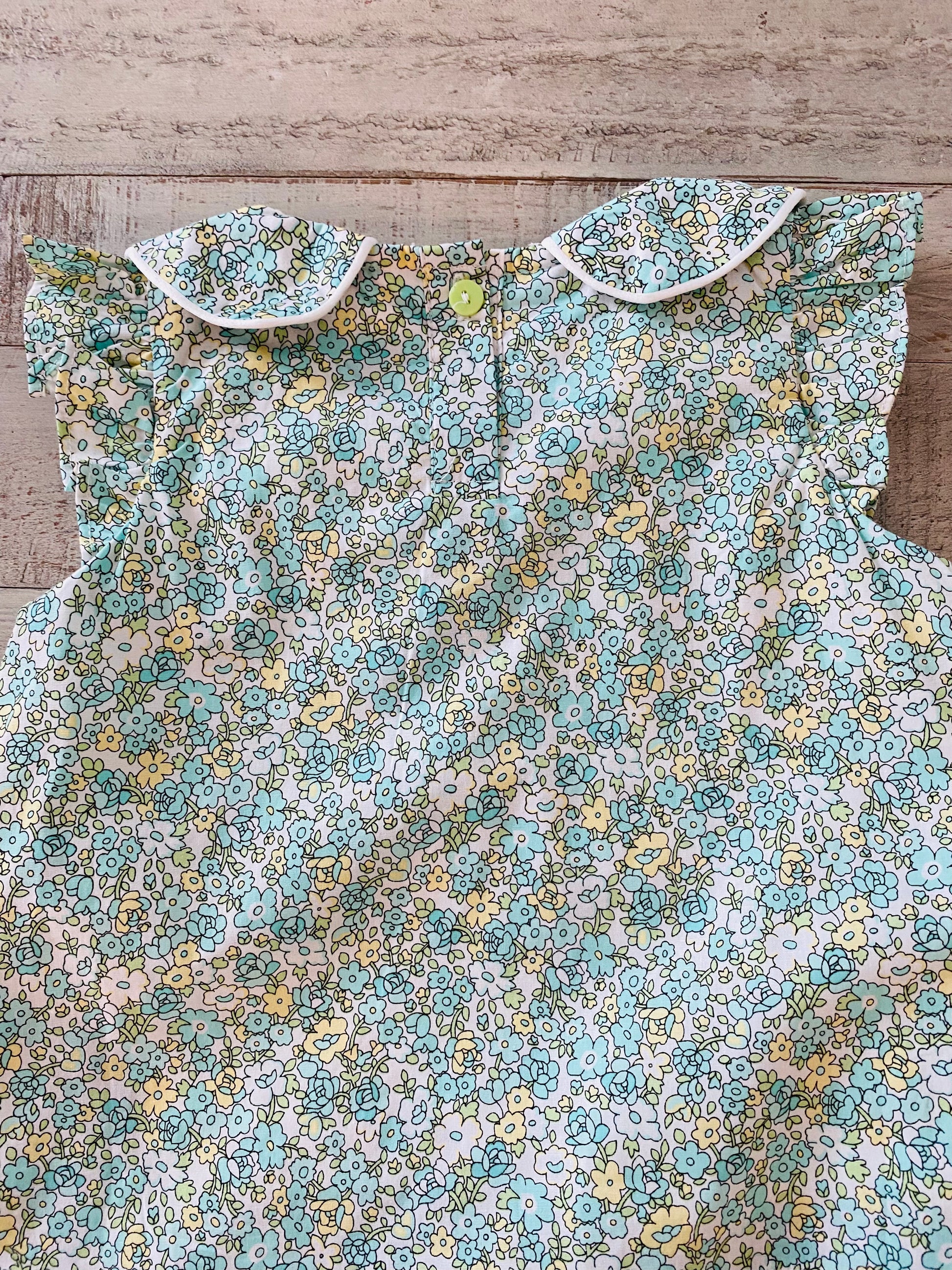 This floral pin stripe diaper set features a sophisticated floral pin stripe design with a classic peter pan collar and delicate flutter sleeves. Keep your little one looking stylish and comfortable with this adorable set.