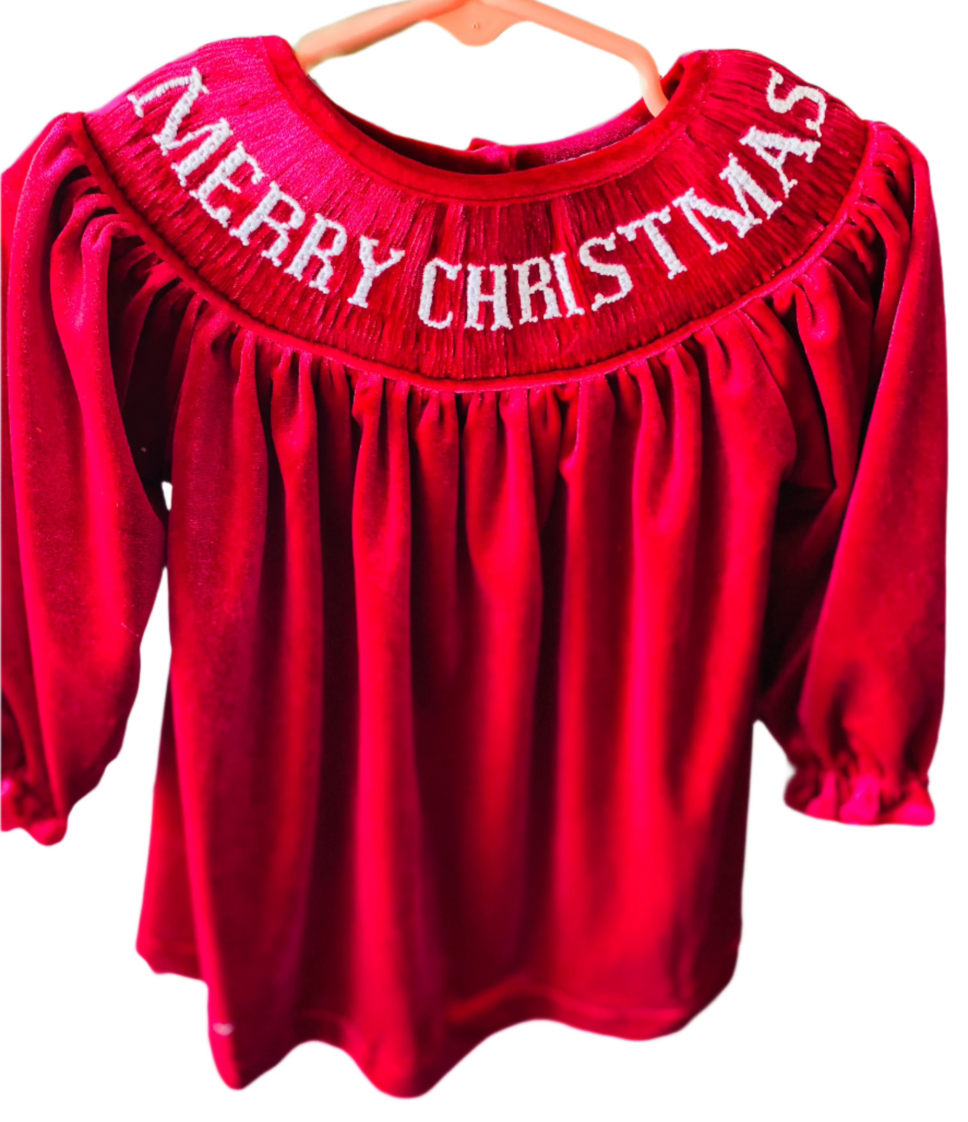 This Merry Christmas Smocked Velvet Dress in elegant red is perfect for any holiday celebration. Made from luxurious velvet fabric, this dress is both comfortable and stylish. The long sleeves provide warmth in chilly weather while the smocked design adds a festive touch. Make a statement this holiday season with this beautiful dress.