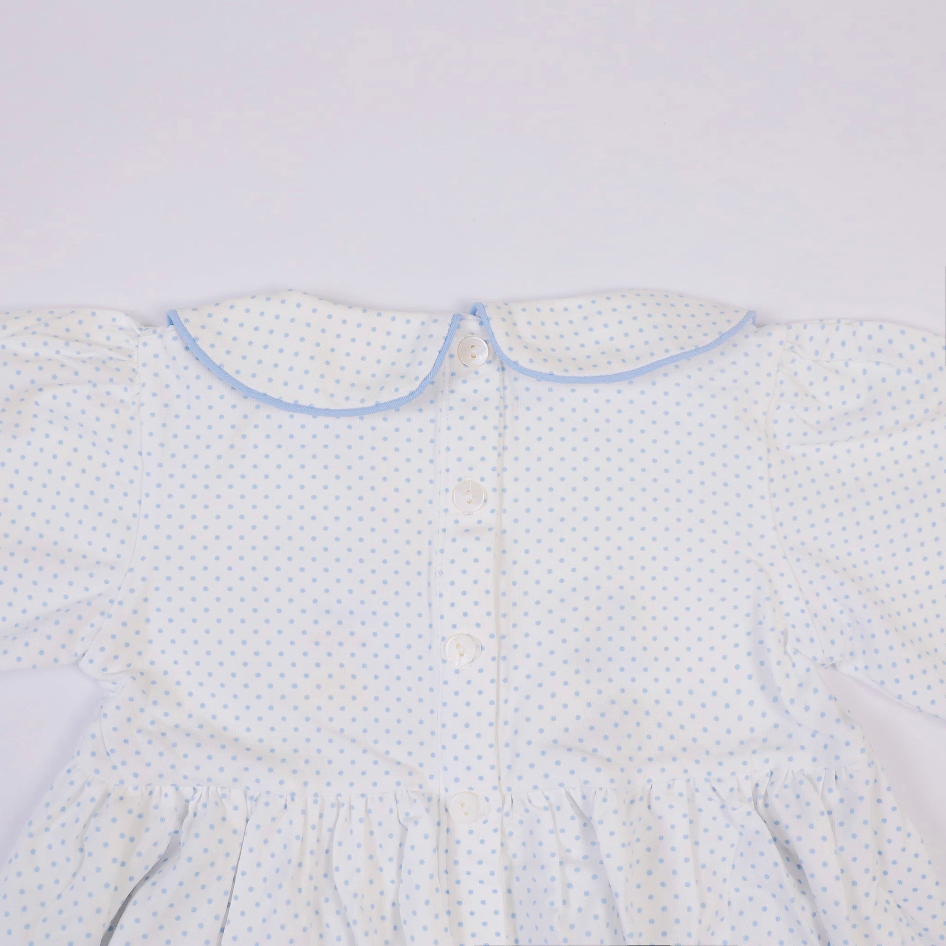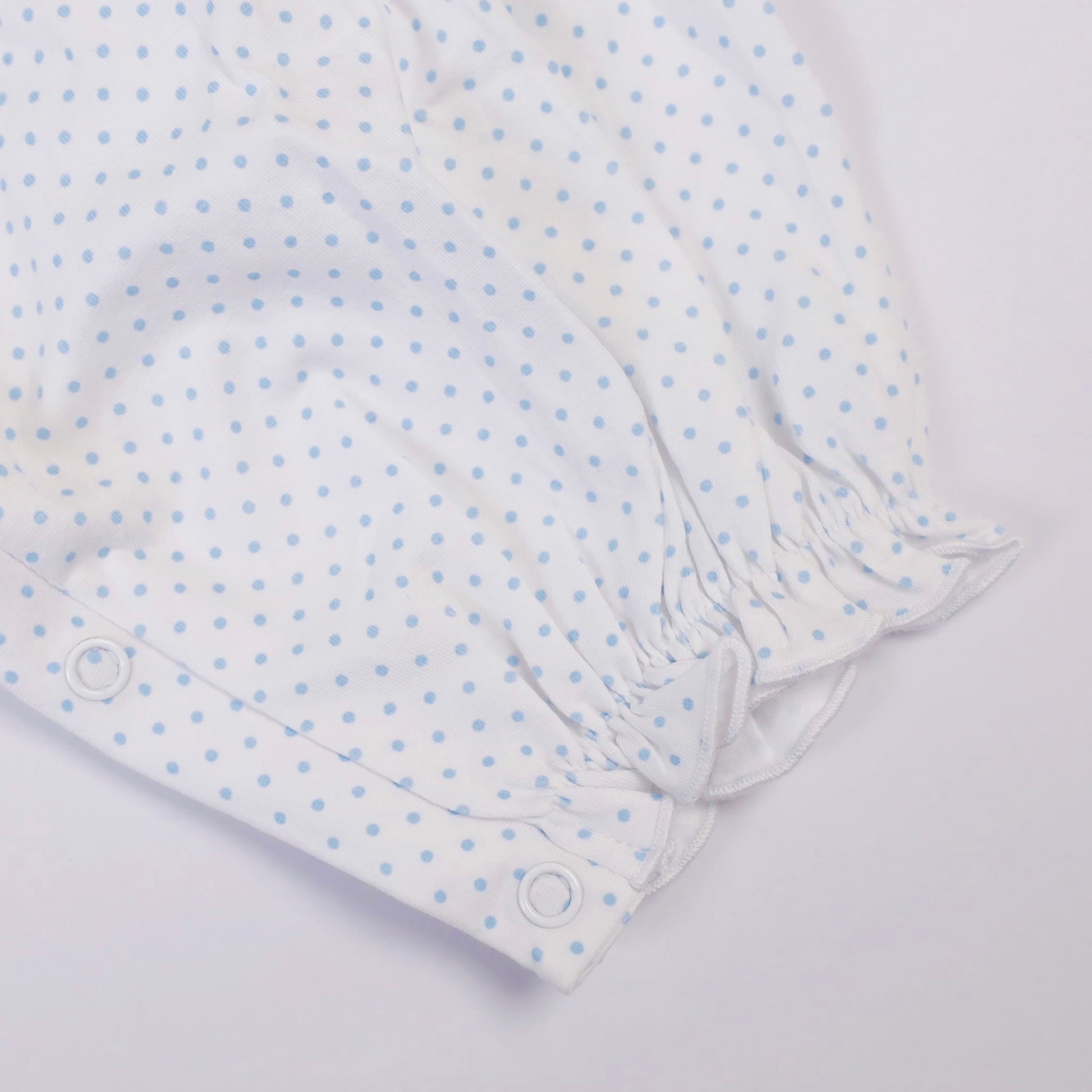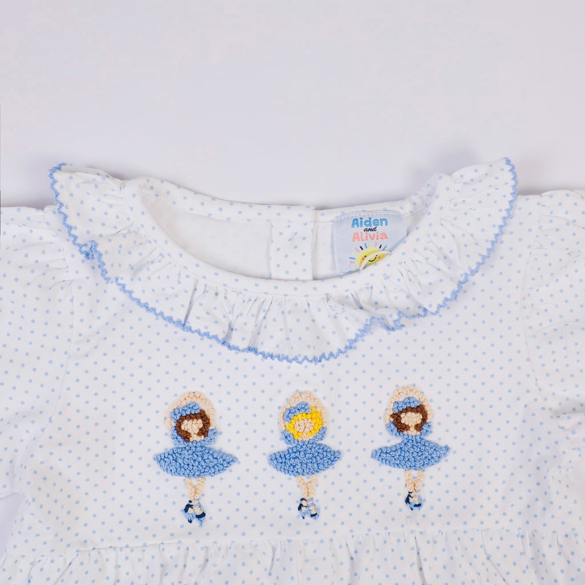 This blue polka dot french knot ballerina is a charming addition to any wardrobe. The intricate French knots add a touch of elegance, while the playful polka dots bring a pop of fun. Perfect for ballet enthusiasts or those looking to add a unique twist to their outfit.