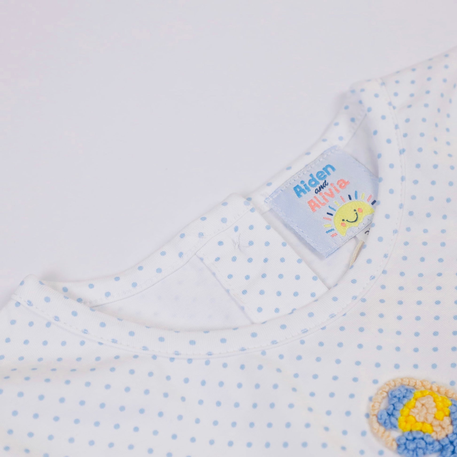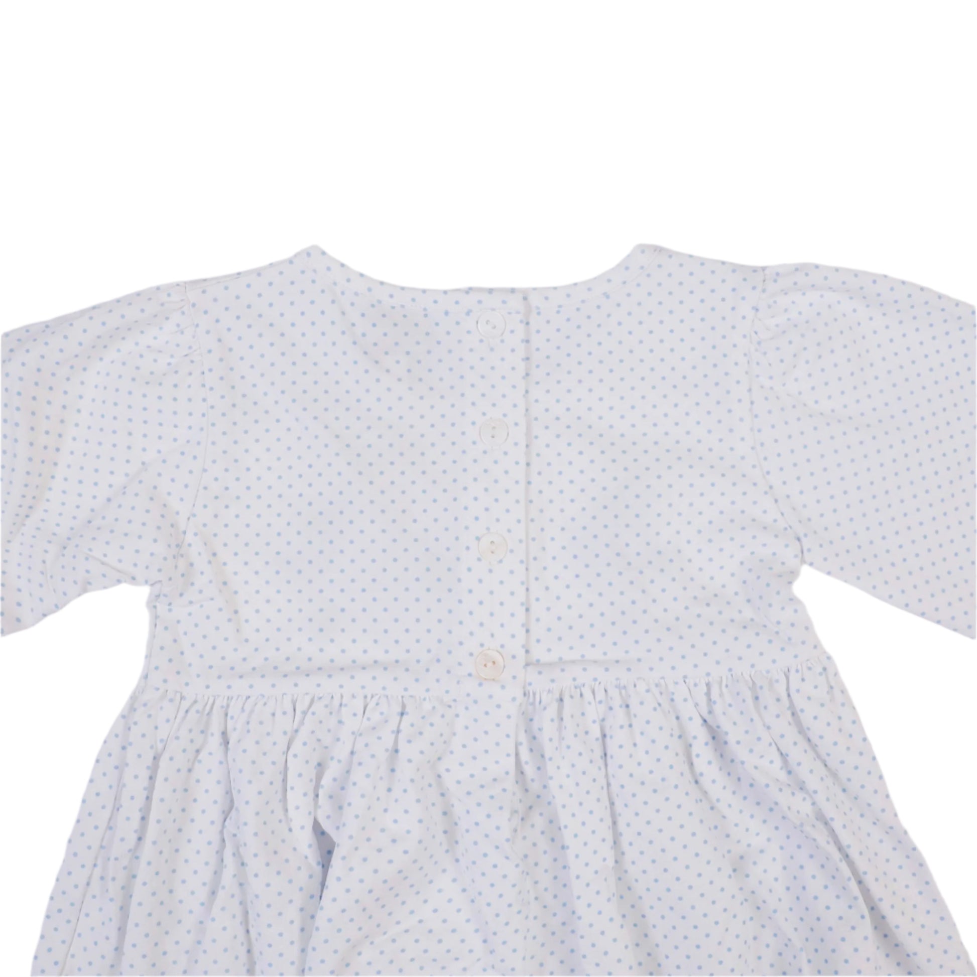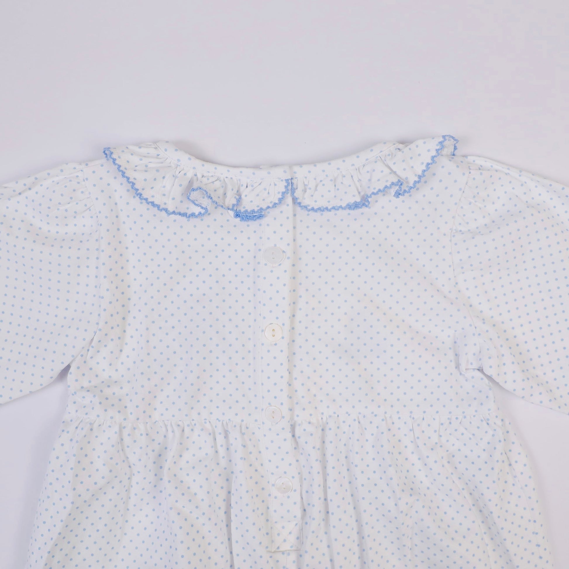 This blue polka dot french knot ballerina is a charming addition to any wardrobe. The intricate French knots add a touch of elegance, while the playful polka dots bring a pop of fun. Perfect for ballet enthusiasts or those looking to add a unique twist to their outfit.