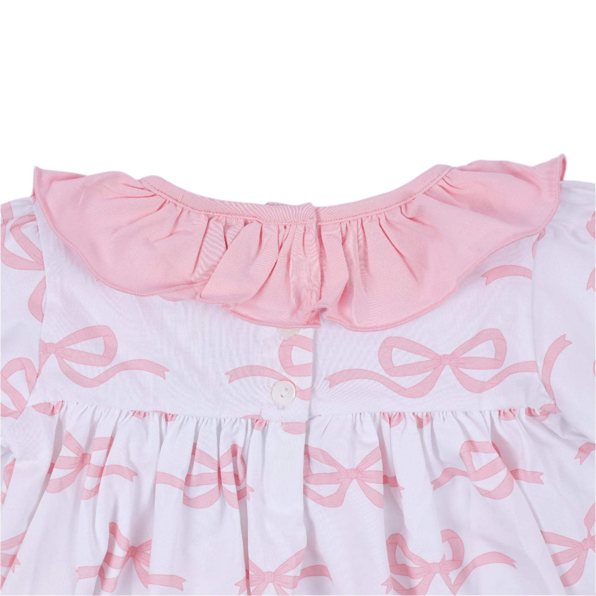 Expertly crafted, this pink ribbon long sleeve bubble exudes elegance. The pink ruffle collar and scalloped trim add delicate touches to the classic design. Perfect for any occasion, this bubble is a wardrobe staple.