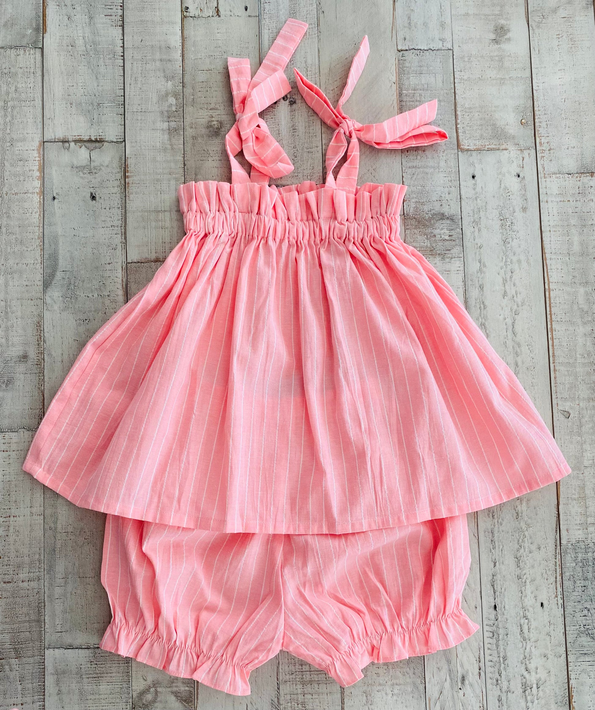 Add a touch of style to your baby's wardrobe with our Summer Pin Striped Bloomer Set. The classic pin striped design offers a timeless and sophisticated look, while the soft and lightweight fabric ensures your baby's comfort. Perfect for warm weather, this set is a must-have for any stylish parent.