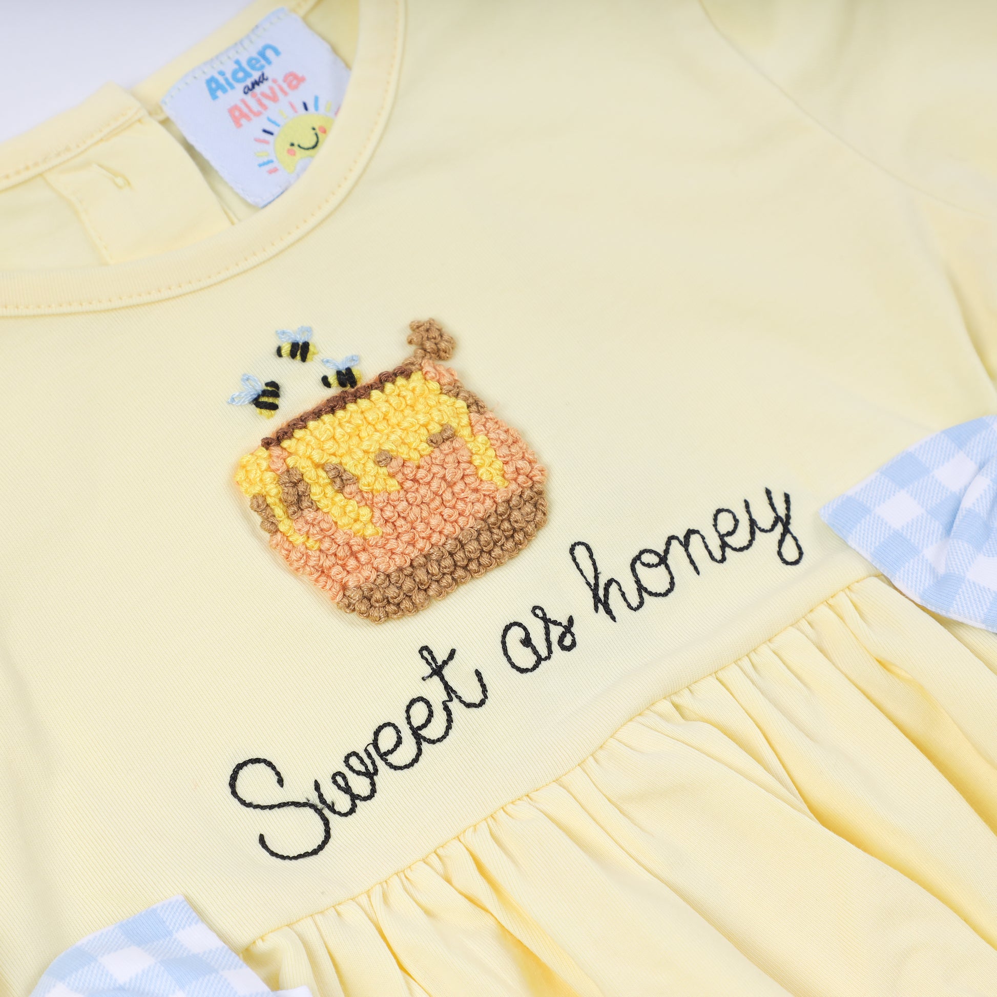 The sweet as honey pant set features charming french knot honey and bees, with a long sleeve design and baby blue gingham pant. Keep your little one snug and stylish with this adorable set. Perfect for any occasion and guaranteed to bring a smile to your little one's face.